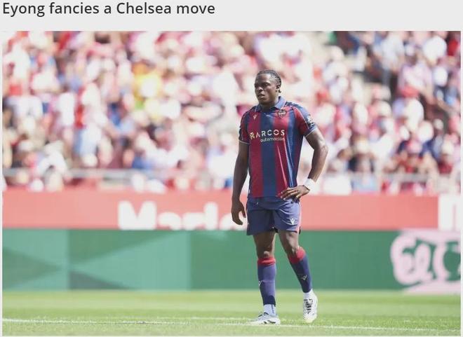 莱万特前锋卡尔-埃塔-埃永最近和曼联、阿森纳以及切尔西等英超豪门联系在了一起,而这名22岁的新星在接受采访时表示他的梦想是加盟切尔西。